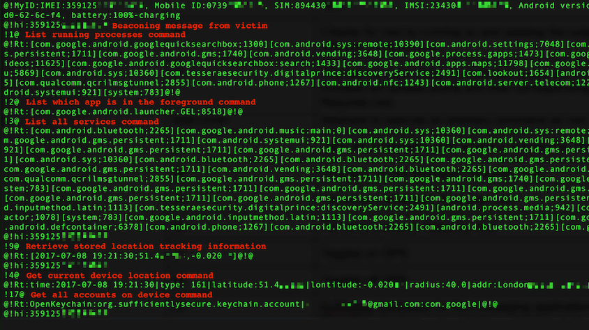 JadeRAT supports over 60 commands that can be issued in the format !<command_id>&<optional_cmd_params>@. Many of these offer standard information gathering functionality seen in typical mobile surveillanceware, however JadeRAT supports several less common capabilities. These include notifying an operator via SMS when a device has booted and silently dropping calls and texts to attacker specified numbers. The following are JadeRAT's core capabilities: